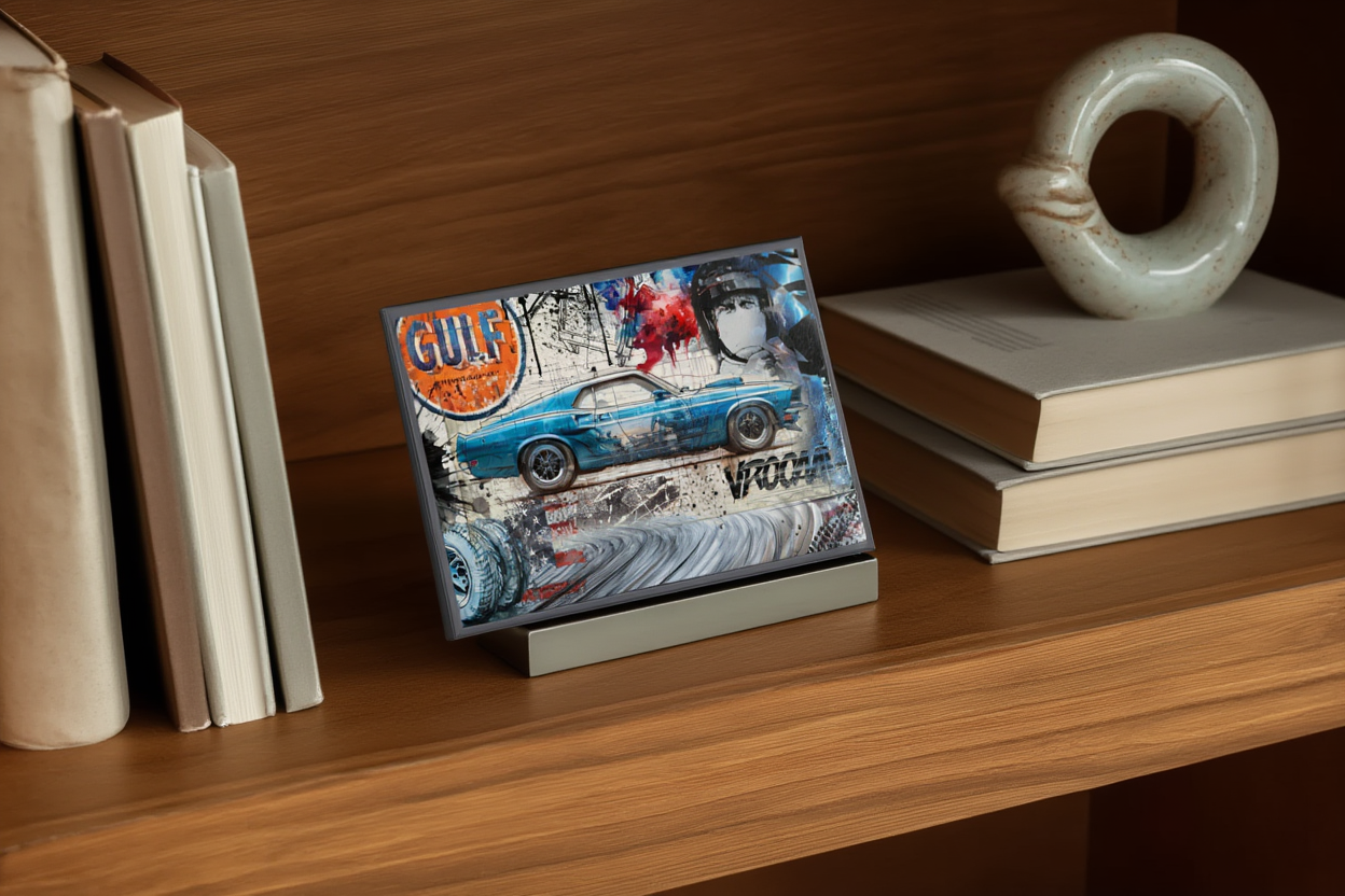L’œuvre est réalisée par impression numérique haute qualité sur plaque de Dibond (aluminium), un support reconnu pour sa rigidité, sa légèreté et son excellente durabilité. Ce matériau garantit des couleurs intenses, une grande précision des détails et une tenue parfaite dans le temps.