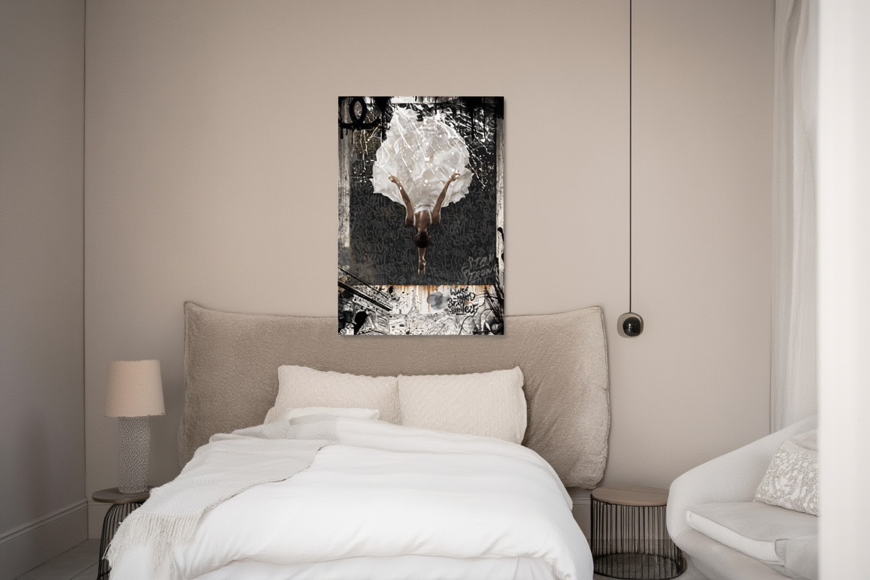 L’œuvre est réalisée par impression numérique haute qualité sur plaque de Dibond (aluminium), un support reconnu pour sa rigidité, sa légèreté et son excellente durabilité. Ce matériau garantit des couleurs intenses, une grande précision des détails et une tenue parfaite dans le temps.